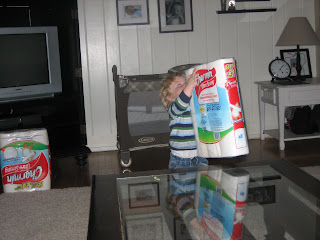 Below are a couple pics that I took last night as we were waiting for Dan to get home. For the past two days Isaac has been totally captivated by the toilet paper packages. He carries them all over the house. It’s both really cute, and kind of annoying.